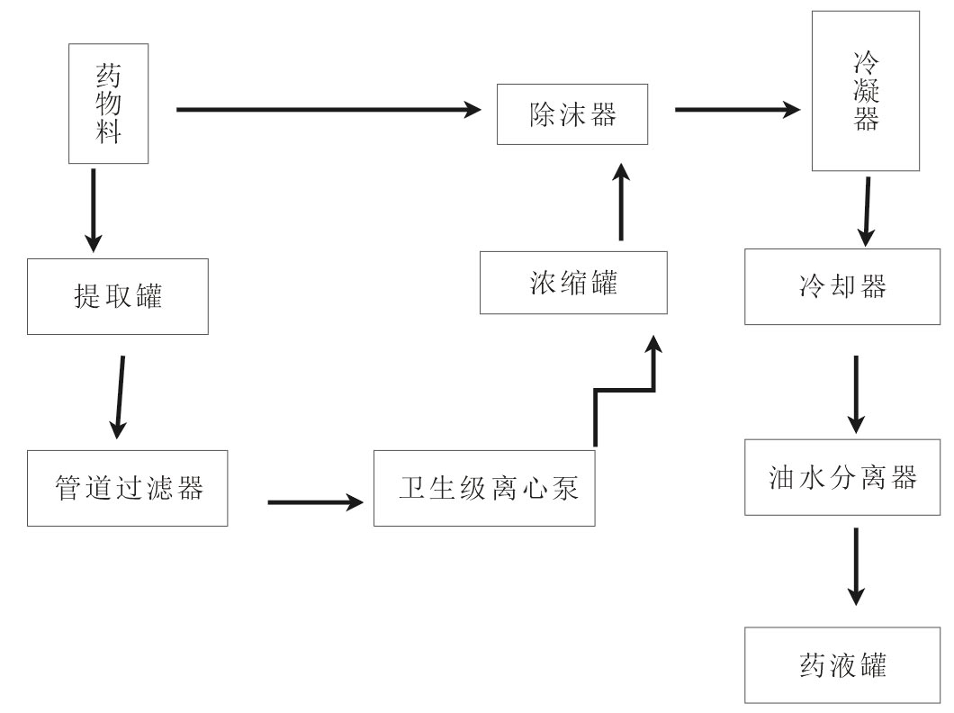 后至過濾器,進入濃縮器。濃縮時產(chǎn)生蒸汽進入冷凝器,成為冷凝液,作為新溶劑噴淋至提取罐同;提取罐內(nèi)產(chǎn)生的二次蒸汽,經(jīng)冷凝器冷
